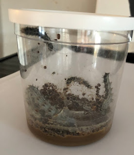 Det var rigtig sjovt, da en enkelt af larverne stadig hang fra låget uden at være blevet puppe endnu og det var derfor nemmere for børnene at forstå at det var larverne der var inde i pupperne.